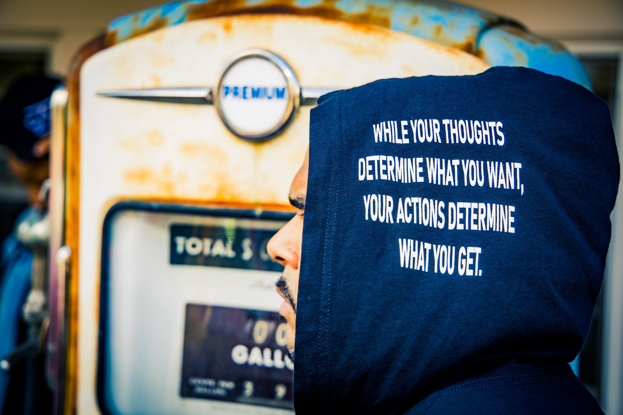 This hoodie was created to make a statement any way you turn, and it does. With the hood quote: While your thoughts determine what you want, your actions determine what you get, is sure to start conversations.
